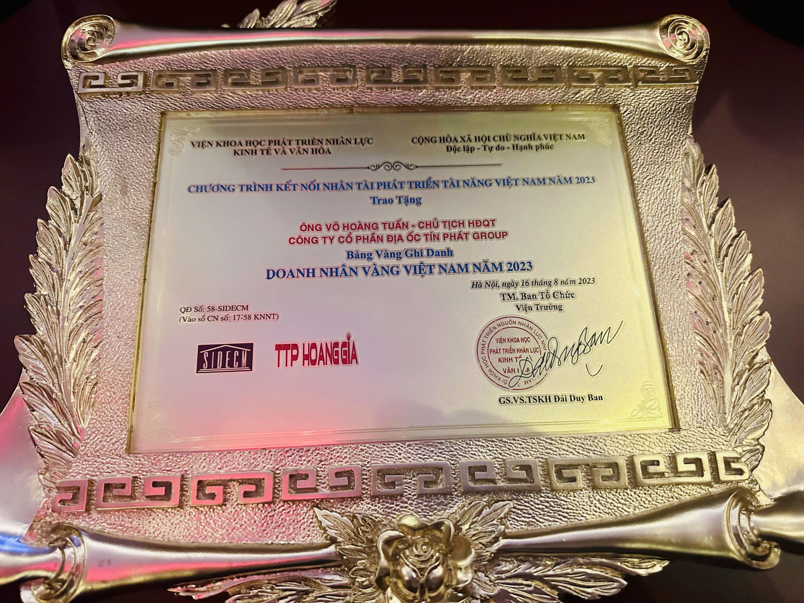 2023 nhận bằng vinh danhDoanh nhân tiêu biểu Việt Nam.